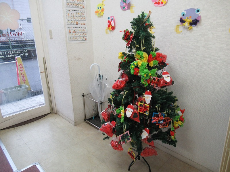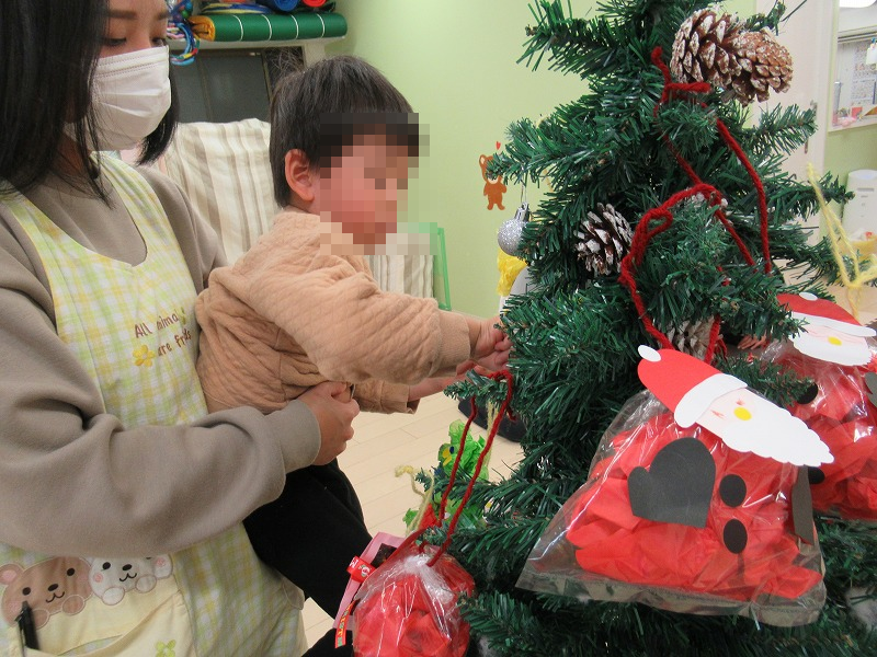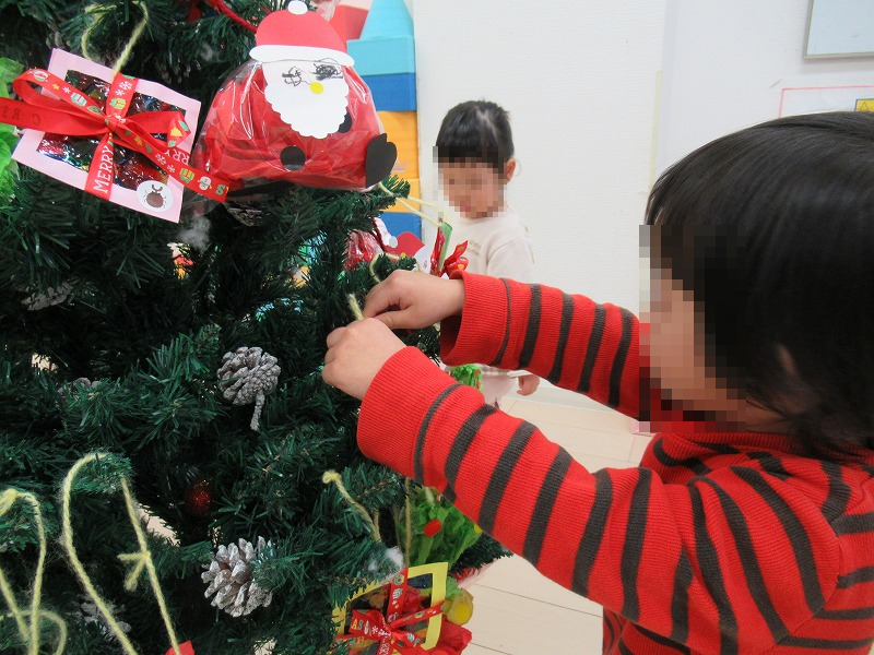 自分たちで作ったオーナメントはもちろん自分たちでツリーに飾り付けます♪届かないところは先生に手伝ってもらって〜よっこいしょ(^-^)