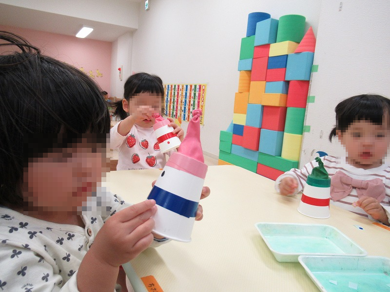 紙コップに風船をくっつけて〜丸めた紙を飛ばします(^-^)