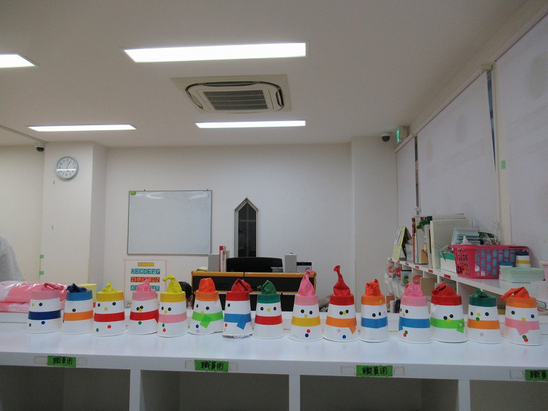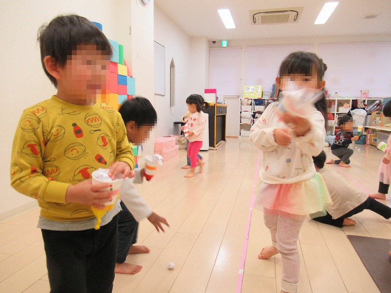 紙コップをシールで雪だるまさんにしたら〜お遊び開始!子ども達、自分たちで作った手作り玩具に大喜び(^o^)お片付けの声がかかっても、「もっと遊ぶ―」ですって(笑)