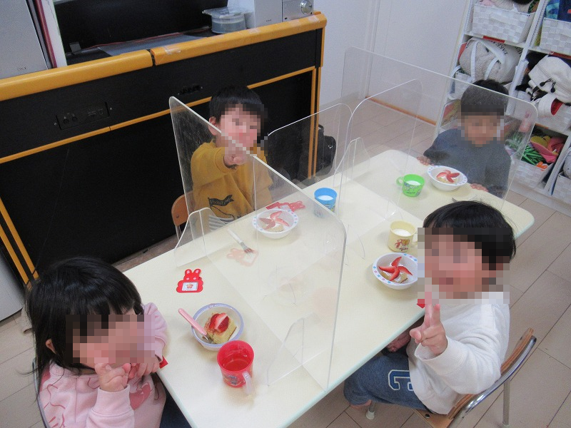 お昼寝から起きたら給食士さん手作りの苺のショートケーキ、牛乳でメリークリスマス!