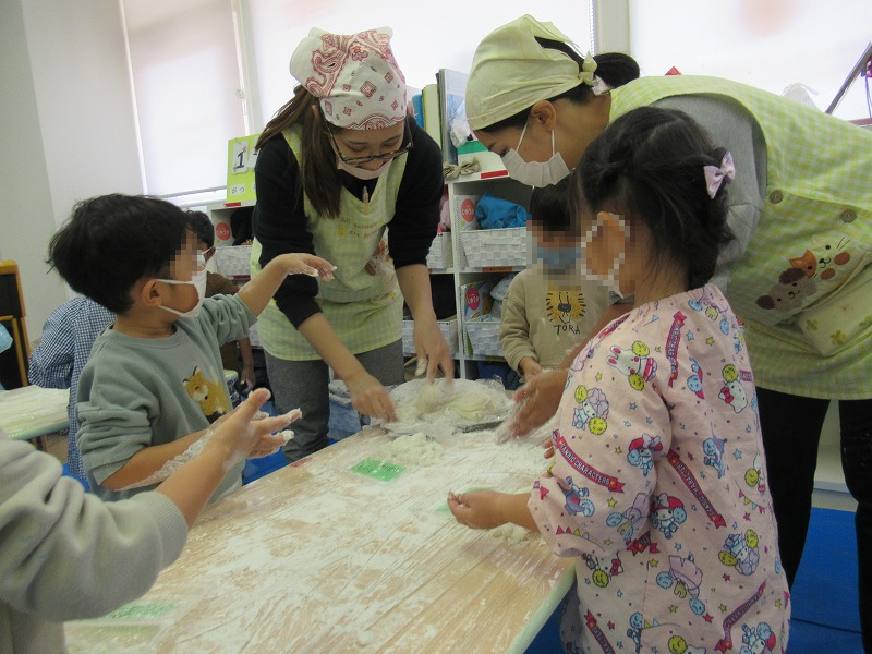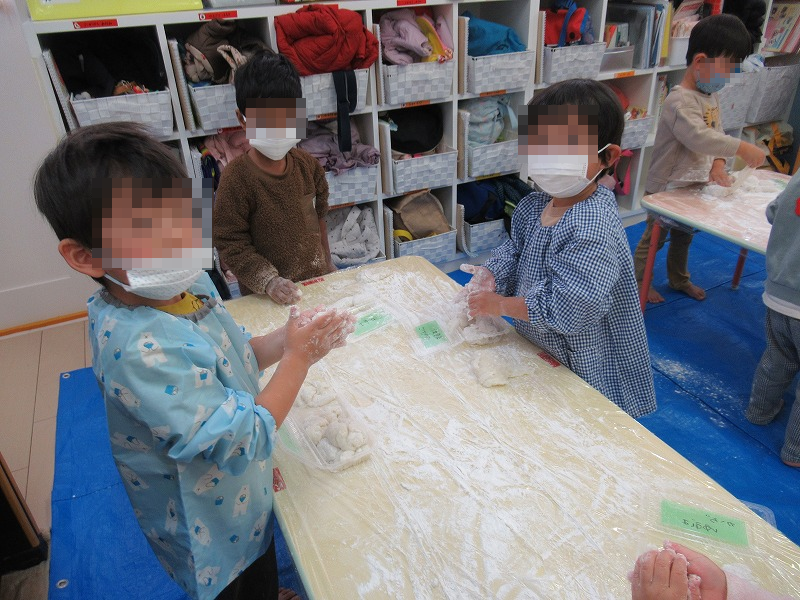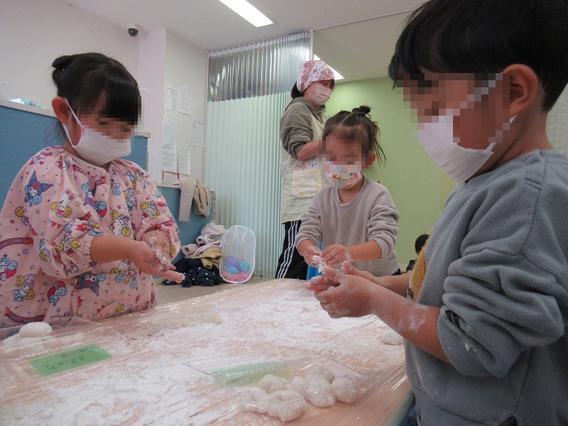 餅つきはまだまだ終わりません。つきあがったお餅は餅取り粉をまぶして〜、ちぎって〜、丸めます(^-^)お母さん、お父さんに美味しいお餅のお土産を持ってかえろうね〜。