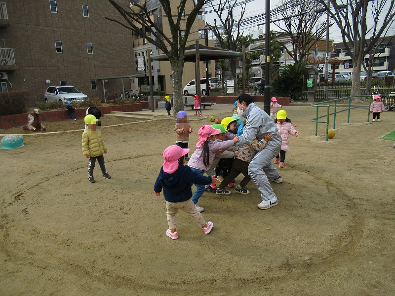 写真は赤組さんにブームの(お相撲さん)とタッチリレー(^-^)寒い時の全身運動、特にお相撲さんは「もう1回、もう1回」と何度もねだられ、来月に還暦を迎える園長はヨレヨレに(笑)