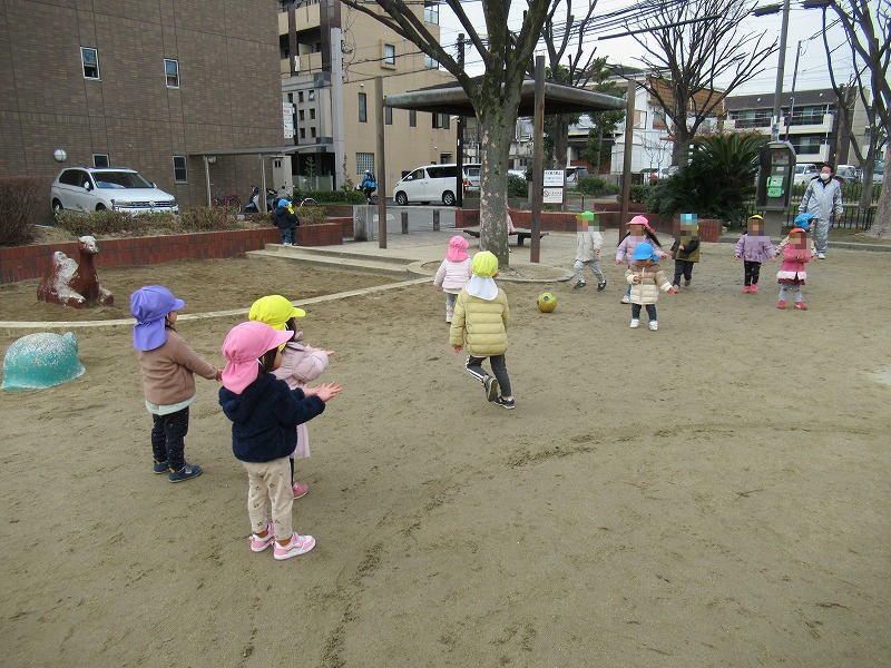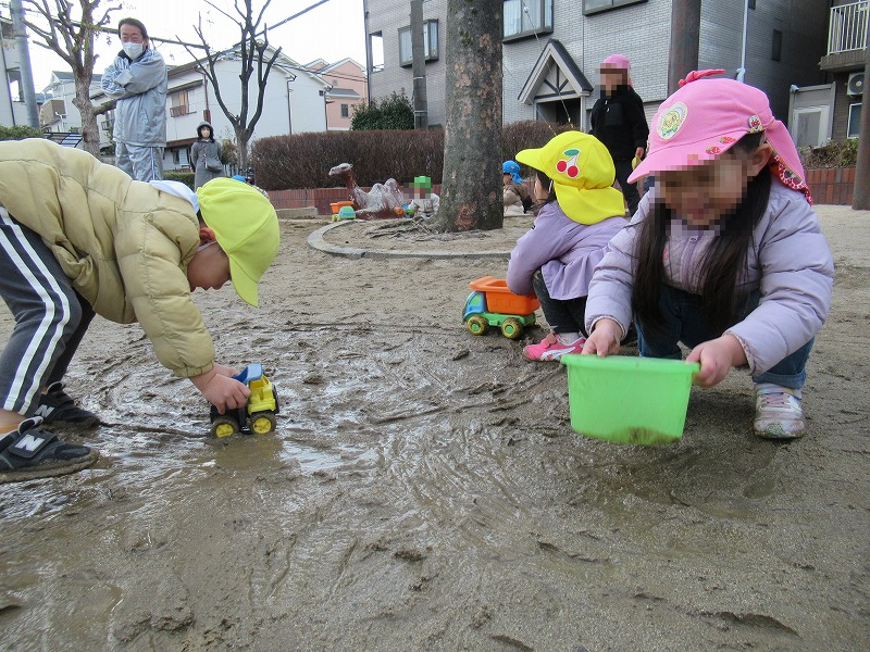 気が付くと、一部の赤組さんが霜でぬかるんだ地面で泥んこ遊びを始めちゃいました、「これこれお洋服が泥だらけになっちゃうよ」と内心思いながら子ども達の楽しそうな笑顔に「まっ、いいかぁ〜」と遊ばせ続けた園長でした。お母さん、すいません!