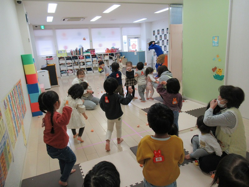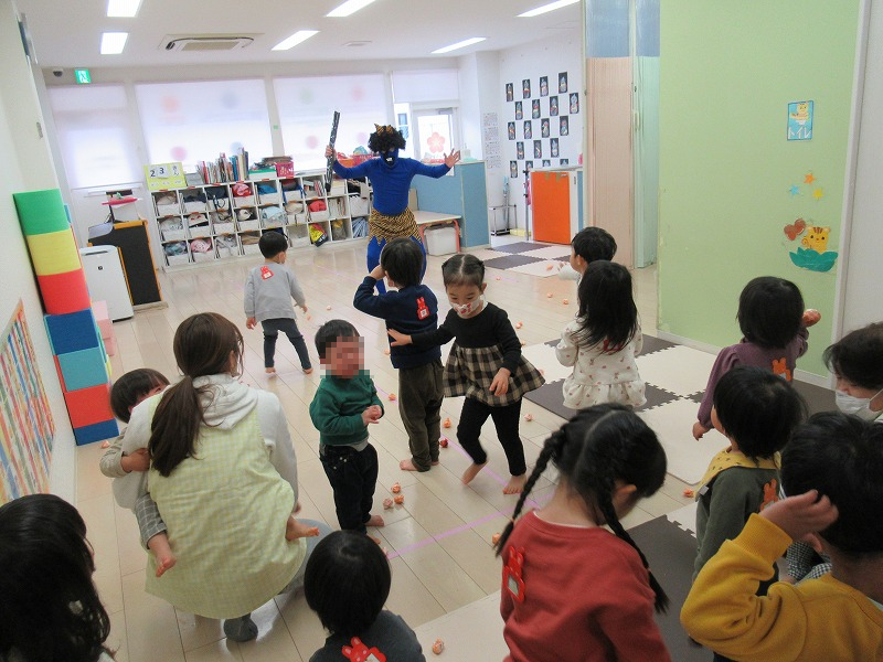 昨日は豆まき♪鬼登場ー(向かっていく子)に(逃げ惑う子)に(泣きじゃくる子)に(興奮する子)笑「鬼は〜外!」「うぎゃぎゃぎゃー!」「いやー助けて〜」「こるらぁぁー!」「○▽※◇×〜!」園内は阿鼻叫喚、収集がつかない状態に(^0^;)。なんとか鬼を撃退したら園内に向かって「福は〜内!」