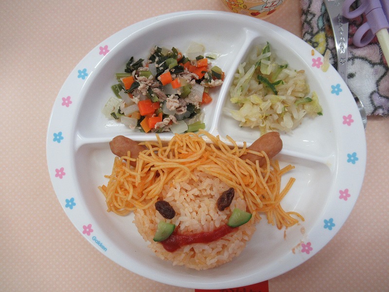 豆まきの後は給食士さんが「おにおにランチ」を作ってくれました♪