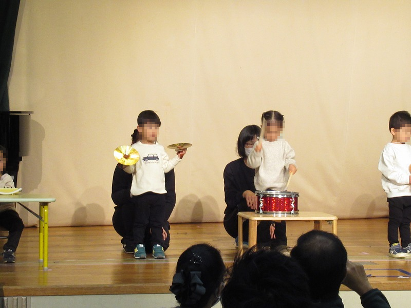 下の写真は赤組さん(2才児)の合奏♪ピアニカ、シンバルン、タイコ、マラカス、タンバリン♪みんな上手にできました!