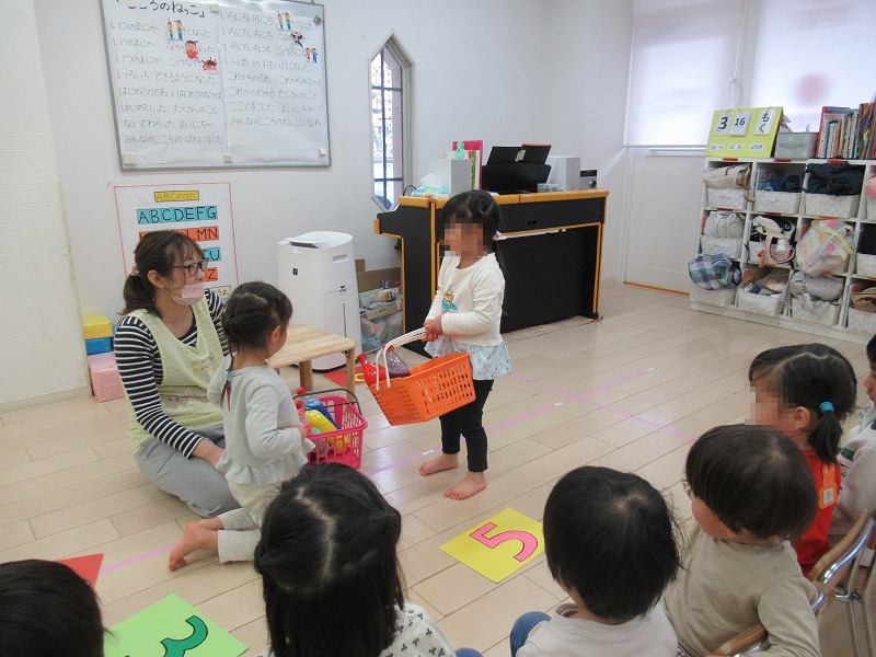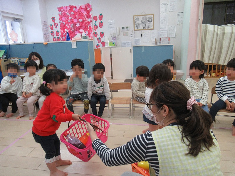 買い物かごにペットボトルを数えながら「1本、2本」入れました、もう一つの買い物かごに「1本、2本、3本、4本」。「わぁー4本の方が重たーい」(^-^)。