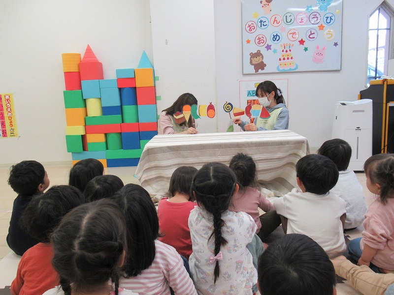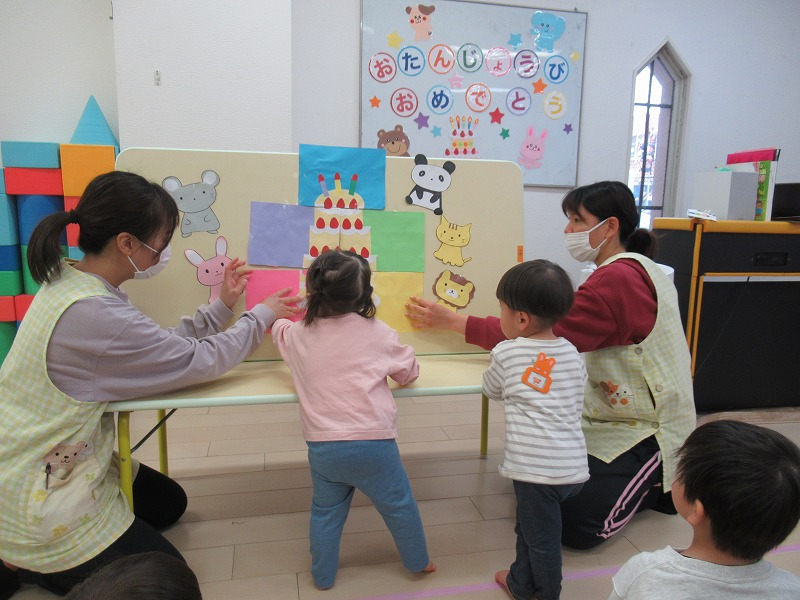バースデーカードを受け取って♪みんなからのお歌のプレゼント♪恒例の先生たちの出し物を楽しんだら〜、給食師さんの手作りケーキ、牛乳でカンパーイ!