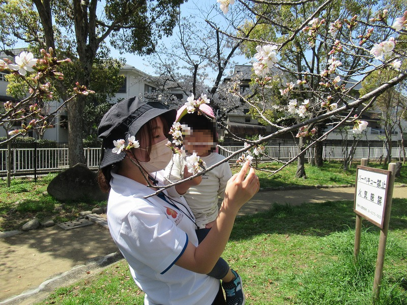 子ども達、遊び疲れて〜、お弁当でお腹もふくらんだら〜、ようやく桜を愛でる余裕がうまれました。「わぁーきれい〜」「花びら可愛い〜」(^o^)