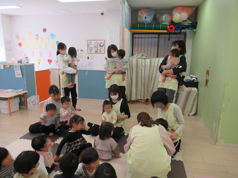 例年通り元気な泣き声が、昨年からの在園時にももらい泣きする子がちらほら、泣き声のオンパレードです(^-^)。子ども達は泣き顔で、先生たちはニコニコ笑顔で。