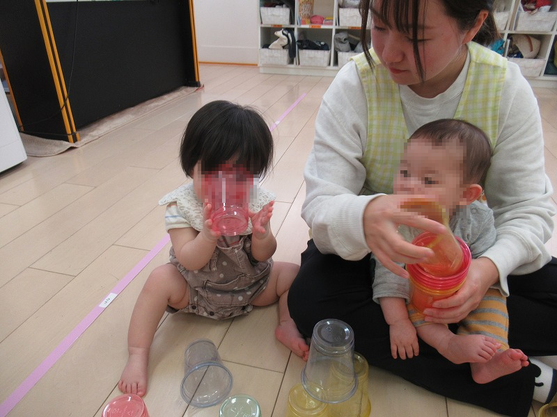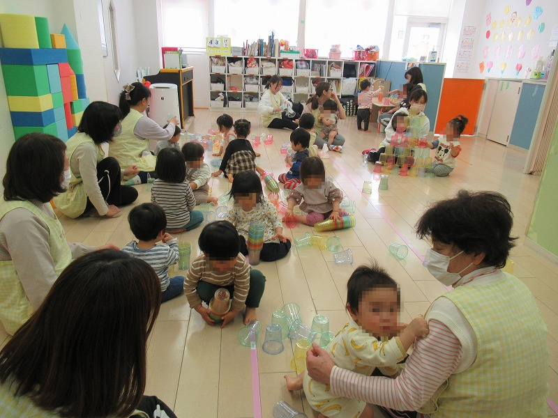 午前の設定保育は「コップブロック」色とりどりのカラーコップに泣き声もおさまっていきます(^-^)/