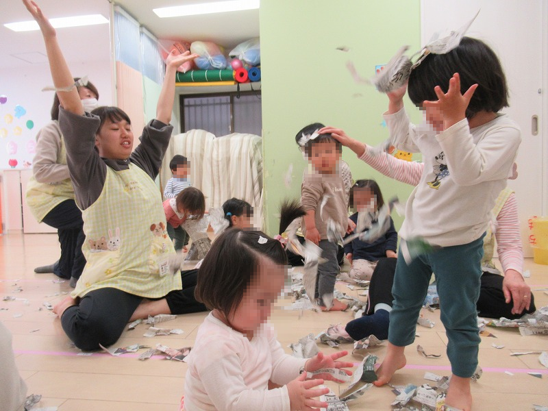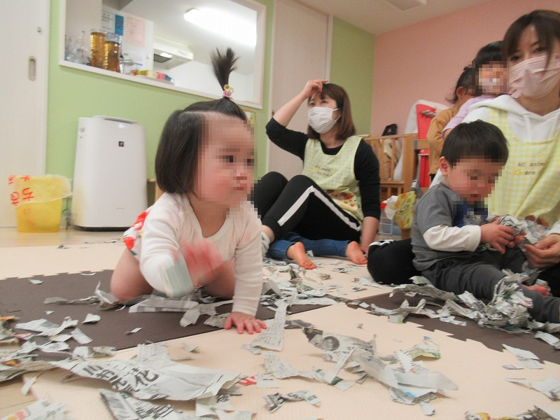 新聞紙を丸めたり破ったり、新聞ごみの中でゴロゴロしたり♪子天使ちゃん達楽しそう〜♪