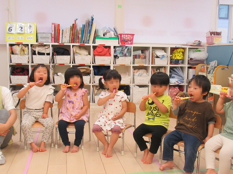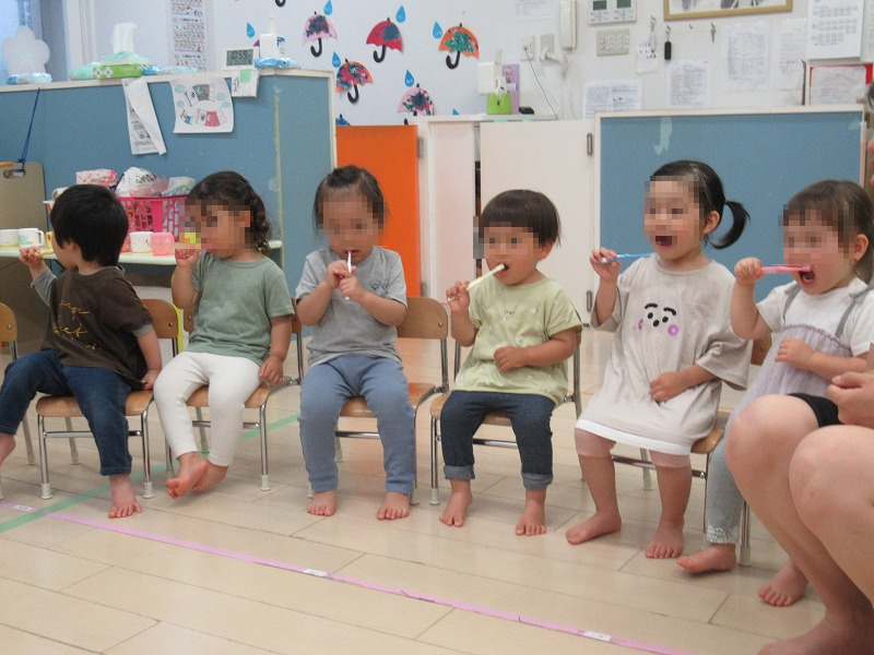 すでに歯磨きを開始している赤組さんはみんな上手に磨けていました。
