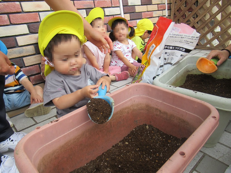 プランターに石をひいて〜、土を入れて〜肥料を混ぜ混ぜ〜、苗を植えて〜お水をあげて〜