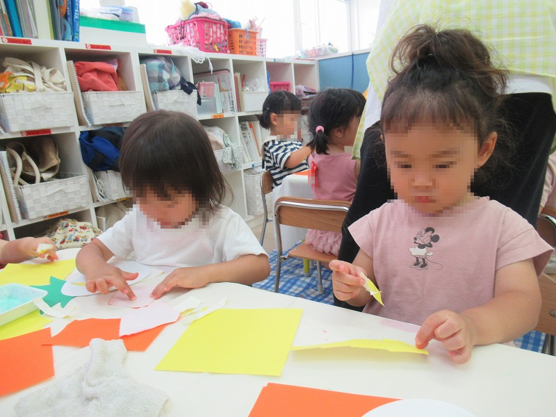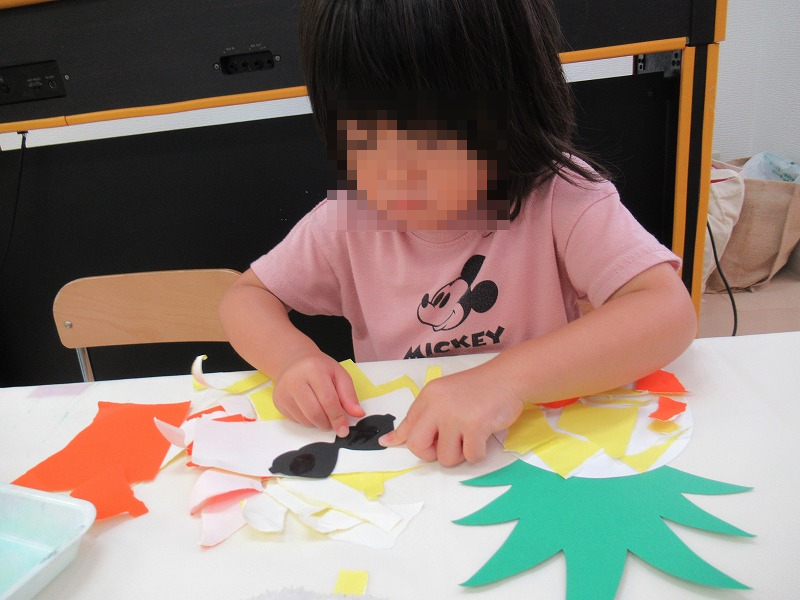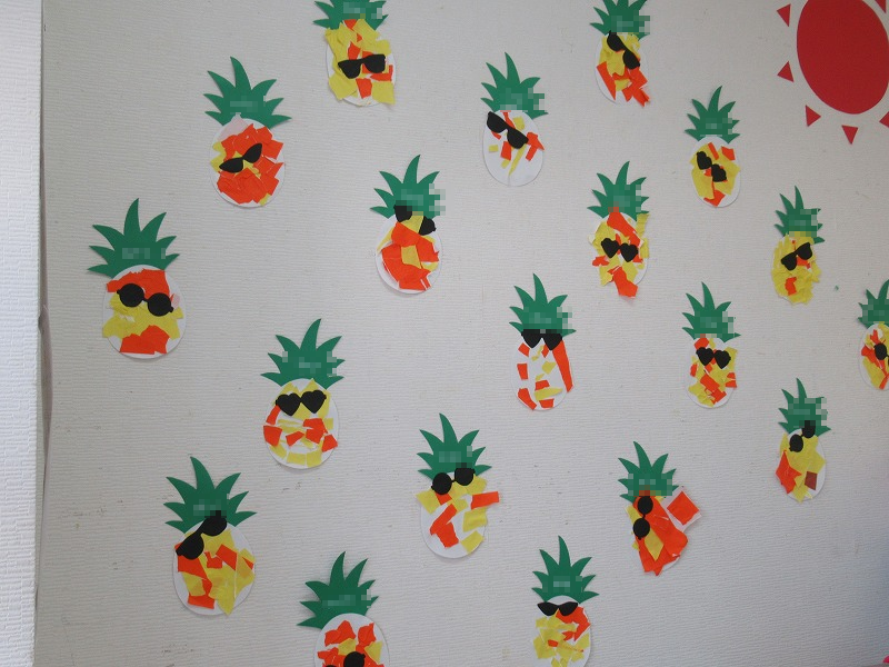 今週は色紙をちぎって貼絵でパイナップルをつくりました。1,2歳児といえども集中力はすごいんですよ(^-^)上手に糊を使ってぬりぬりぺたぺた♪
