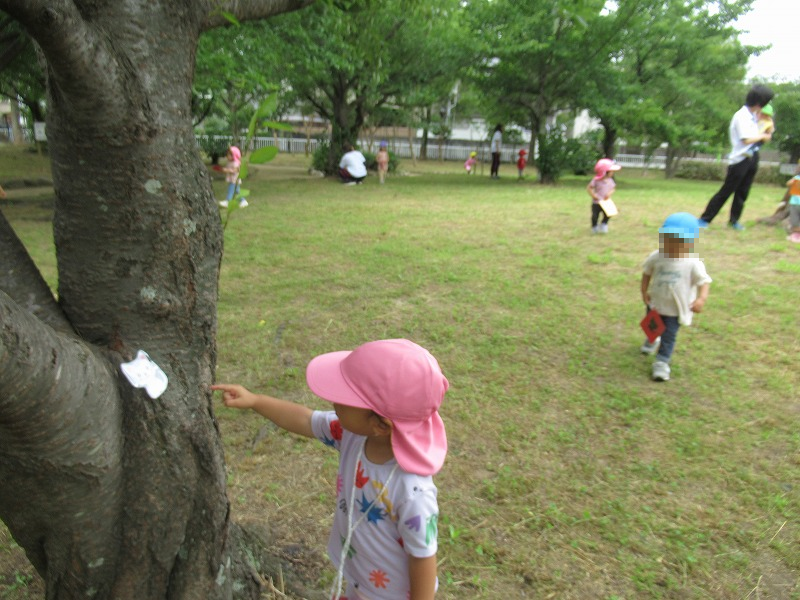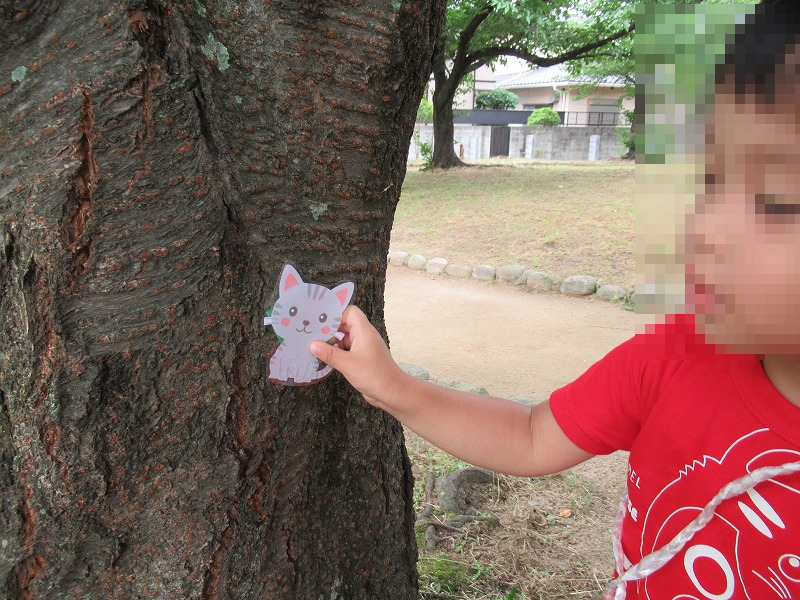 公園(迷いの森と呼んでいます笑)に着いたら先生から冒険の書を渡されます。各々の冒険の書にはいろいろな動物の絵柄が1つ・・森に隠された同じ絵柄を探し出して水の妖精の所に持っていき水爆弾や水鉄砲と交換してもらいます(^-^)/
