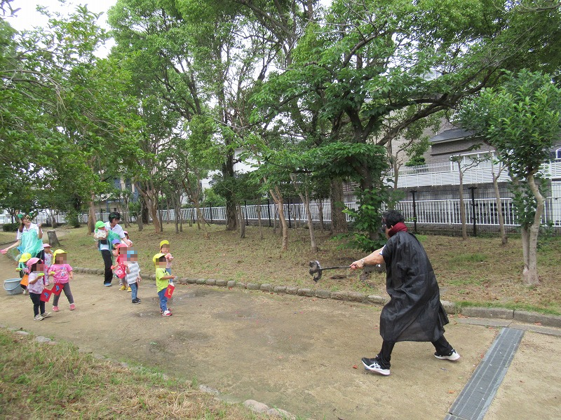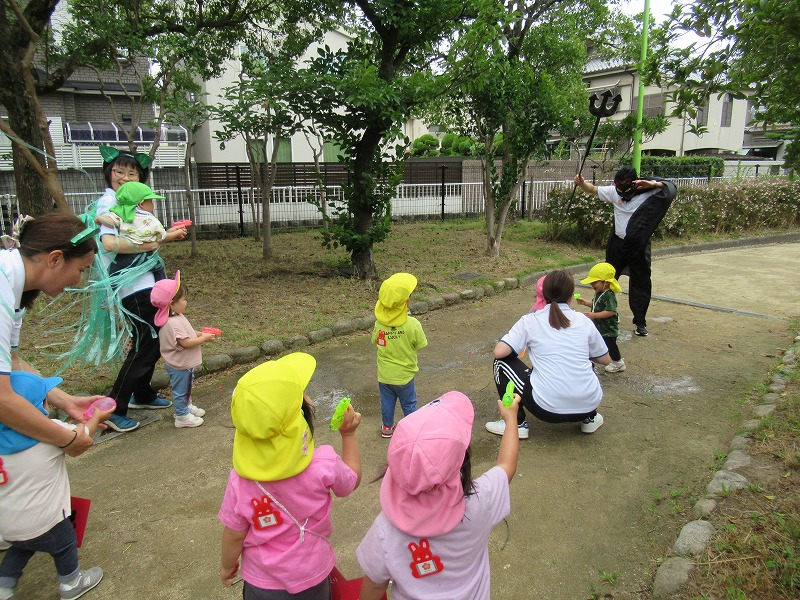 水鉄砲や水爆弾を手に入れた子どもたち、目的地に向かって冒険の旅を続けます。すると途中に魔王が出現!怖くて泣き出すオレンジ・黄組さん。今年も姑息な魔王は泣いている小さな子を狙っています。あとに続く小さな子たちを守るべく赤組さんが魔王の前に出ます。