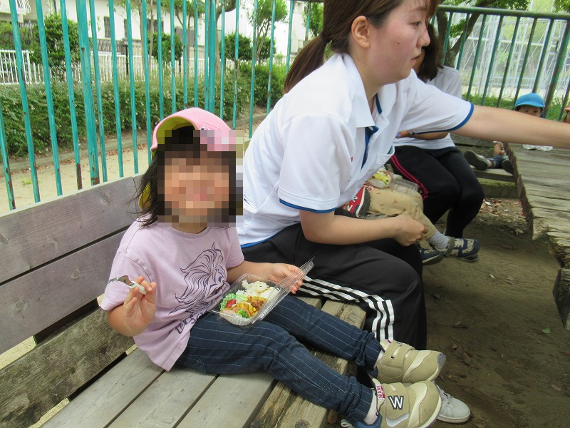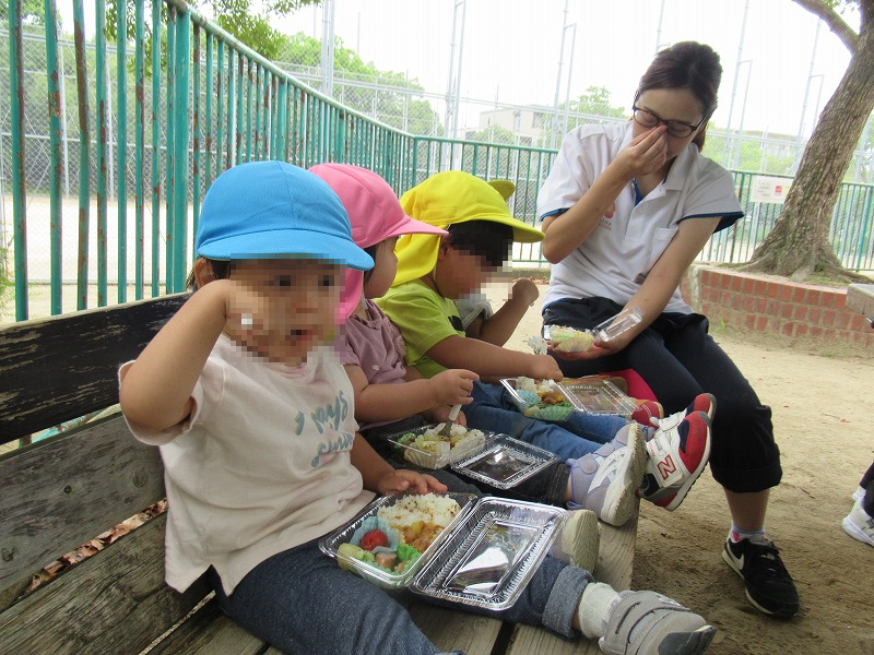 遊んだ後はお待ちかねのお弁当タイム―!給食師さんが6時に出勤して作ってくれました。