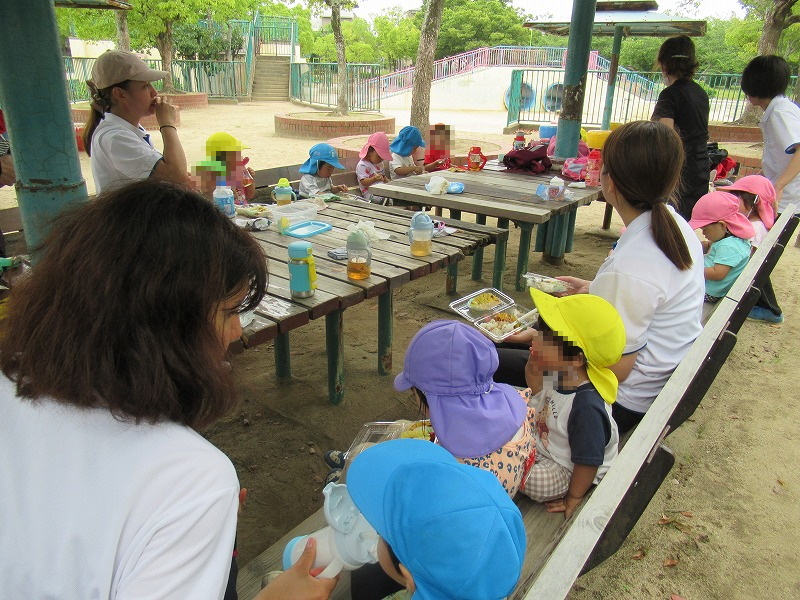パクパクモグモグ美味しいねー(^o^)お外で食べるお弁当は格別みたい。