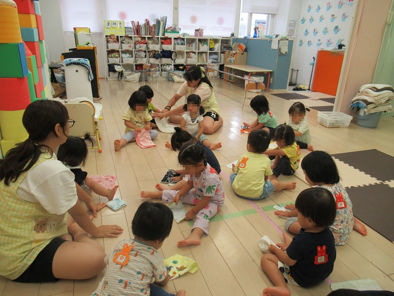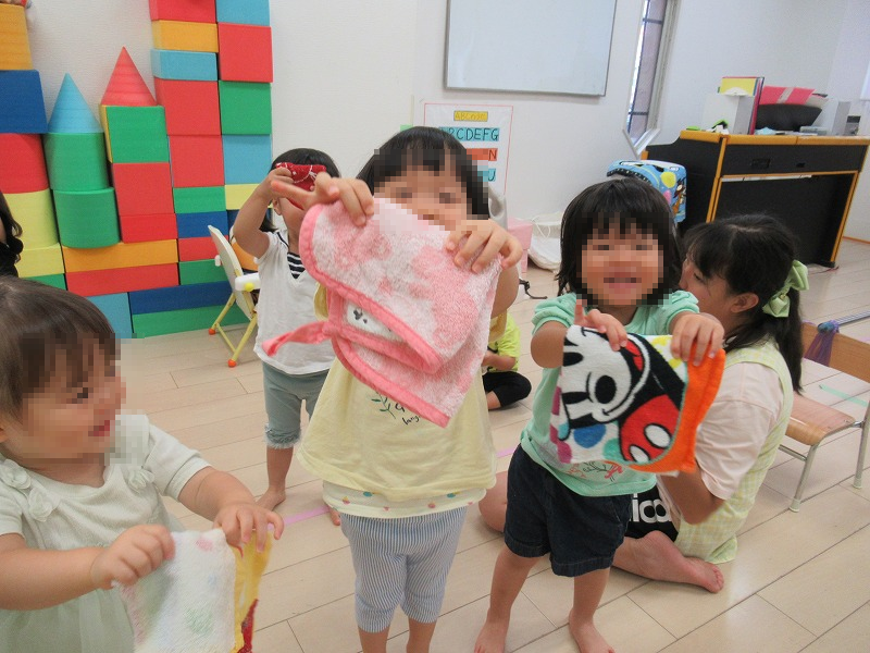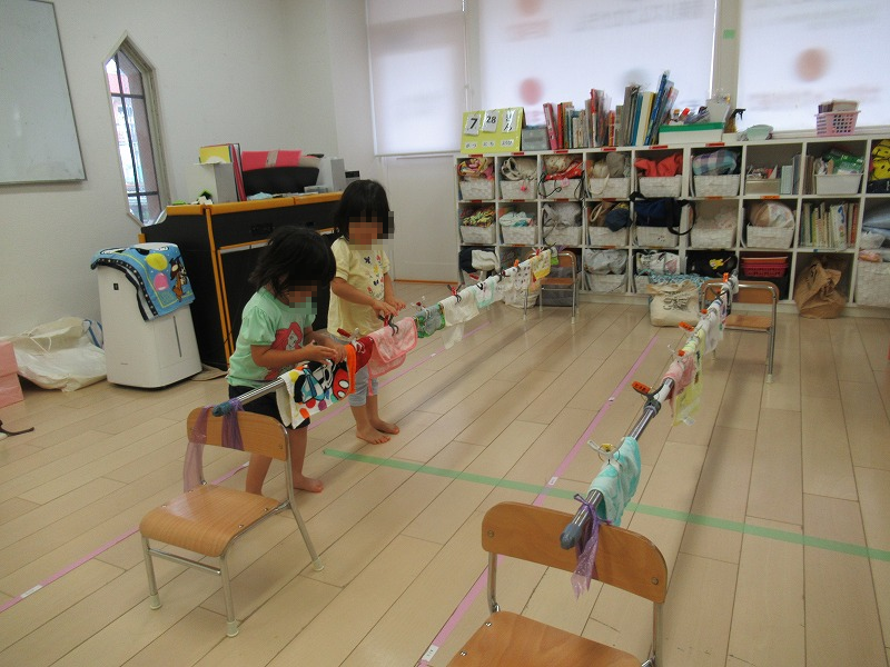 洗濯ごっこ→プール遊び→給食→お昼寝→おやつ→洗濯物は見事に乾いていました(^-^)