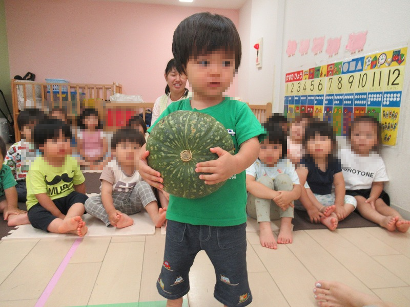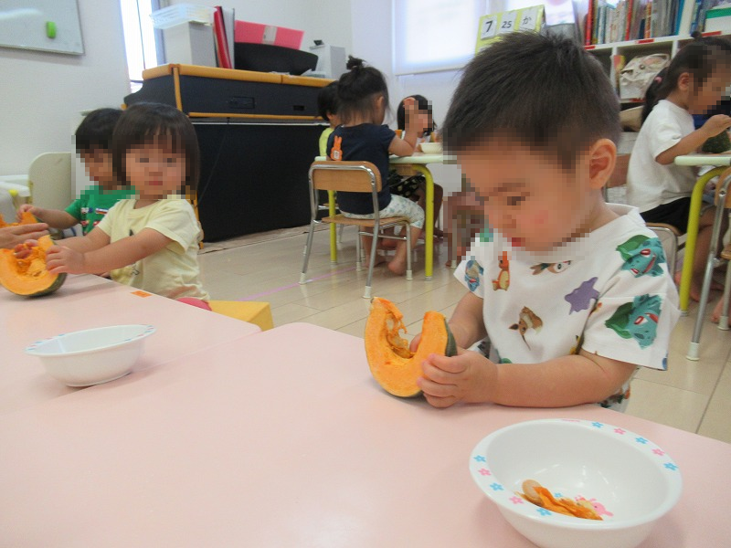 今週の食育はかぼちゃの種取り(^-^)初めは恐る恐る気持悪そうに種をつまんでいましたが・・(笑)