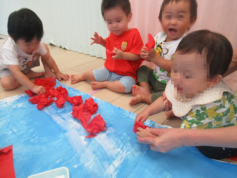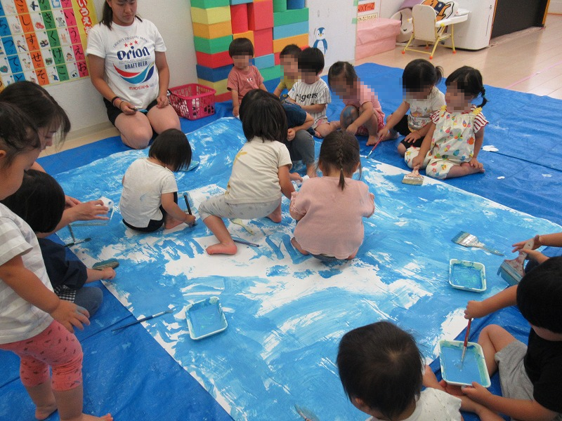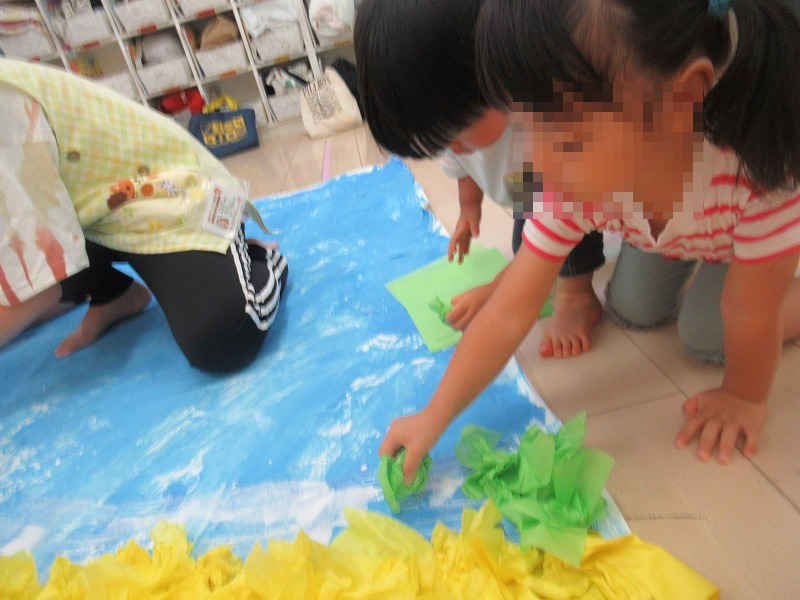 夏祭りが近づいてくると、子どもたちの合同制作物つくりが始まります。毎年エントランスに展示して、来場者をお出迎え(^-^)