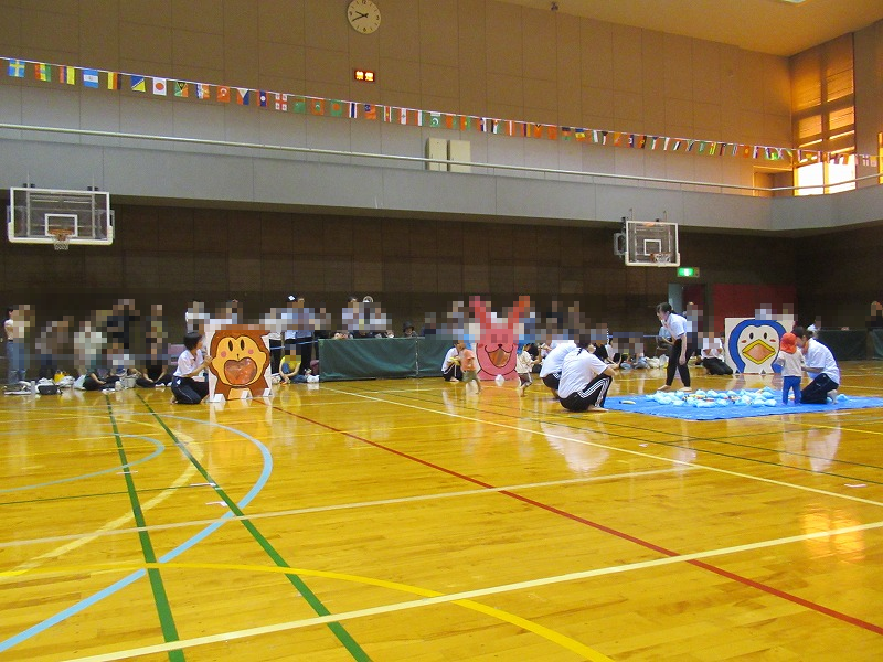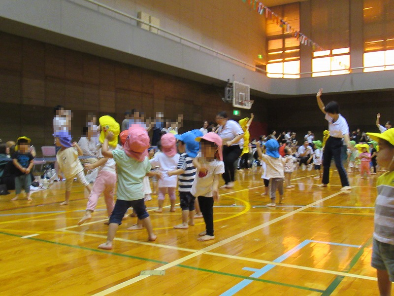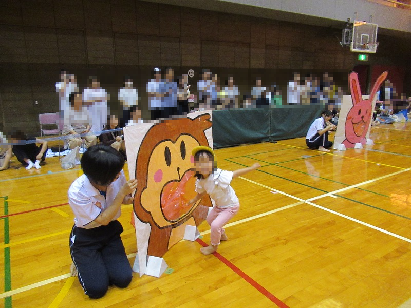 バナナくん体操がすんだら、いよいよ各園対抗競技がスタートします(^-^)ひとつめの競技は「えさやり競争」みんなーがんばれー!(^o^)/