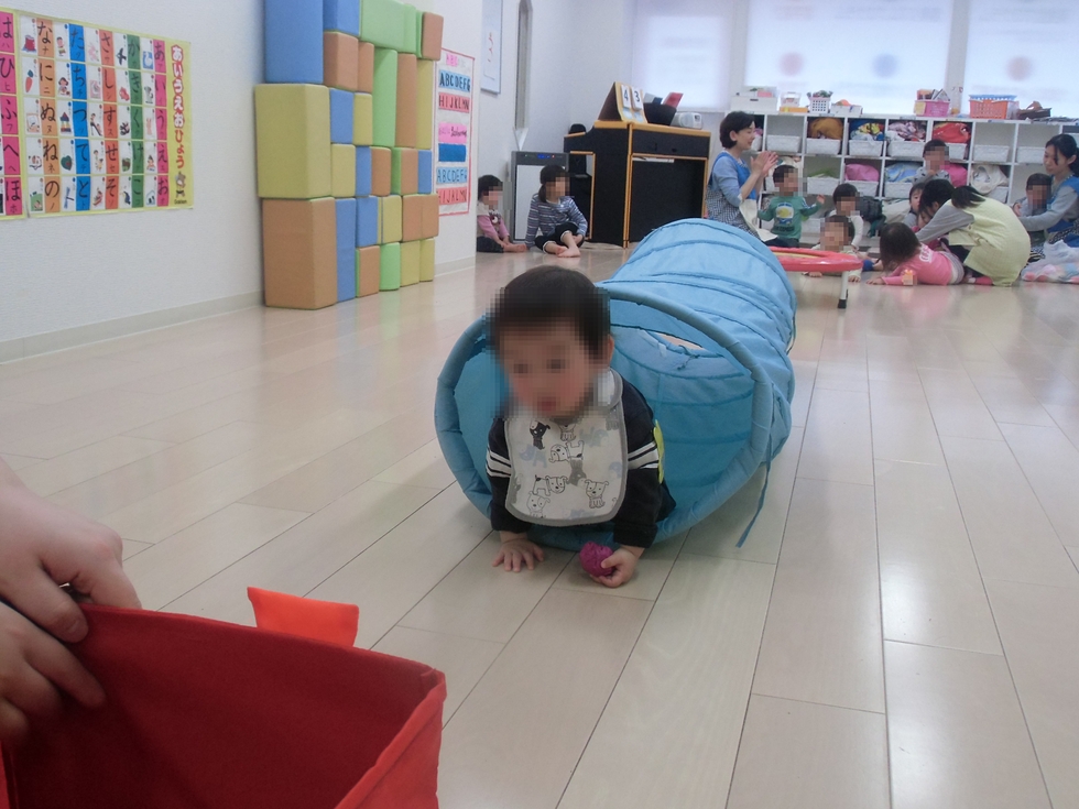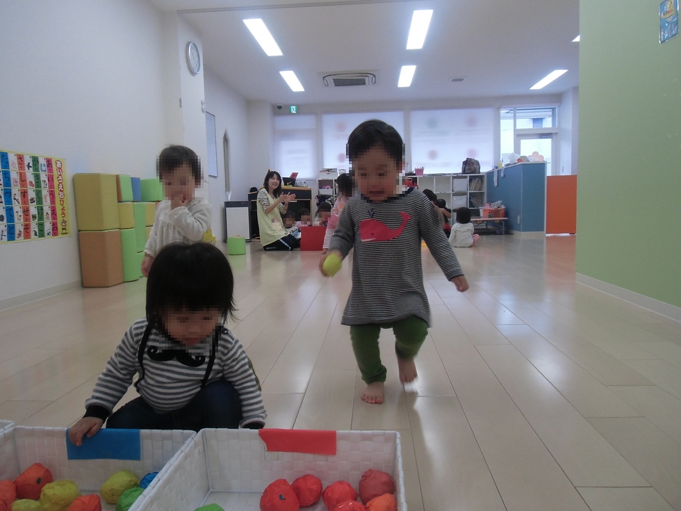 走っていって、ボールを同じ色の画用紙の貼ってあるカゴに入れます。