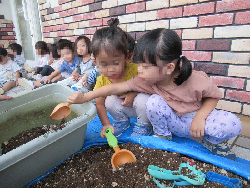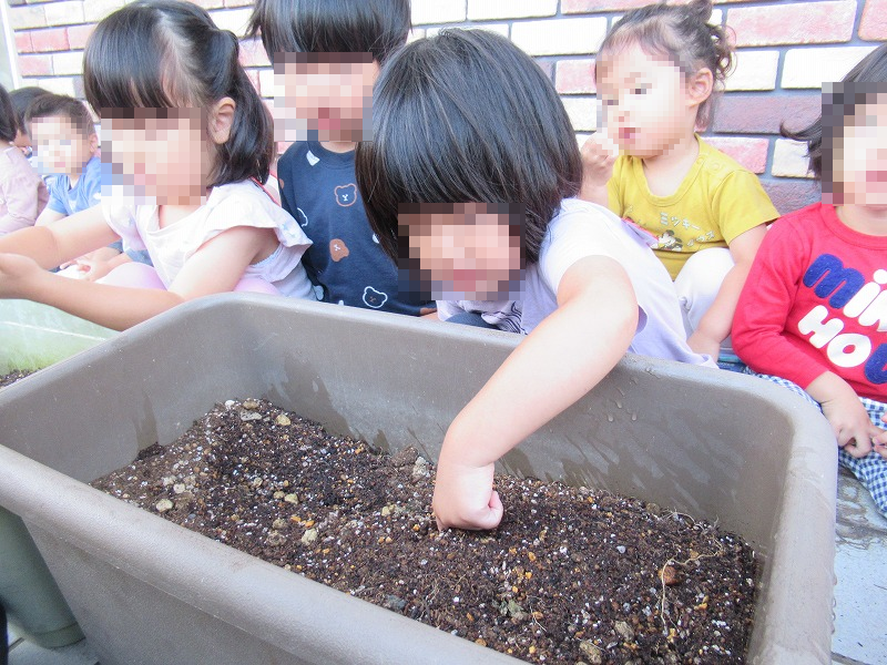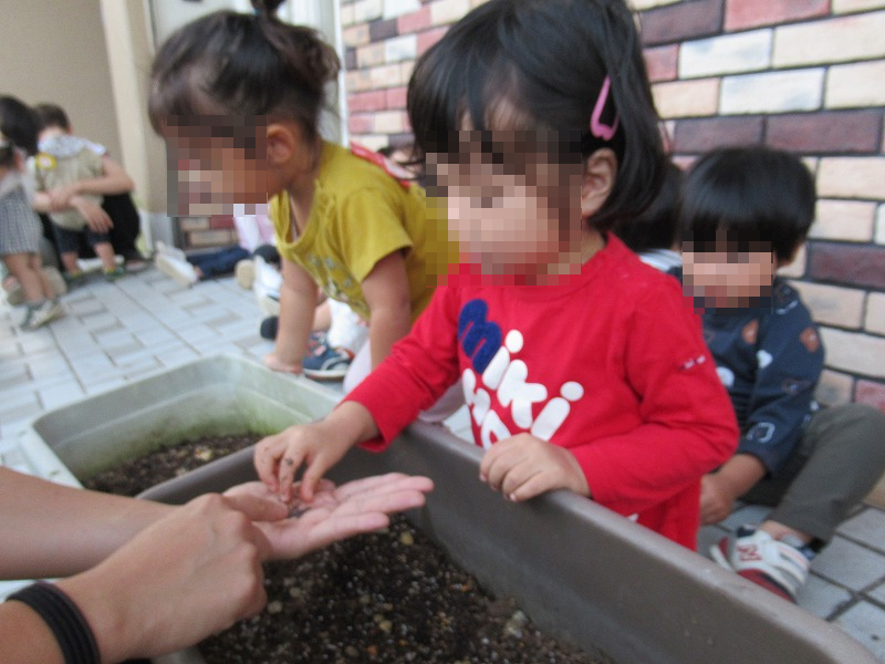 プランターに土と資料を入れて〜指であけた穴に〜種を落としていきます♪