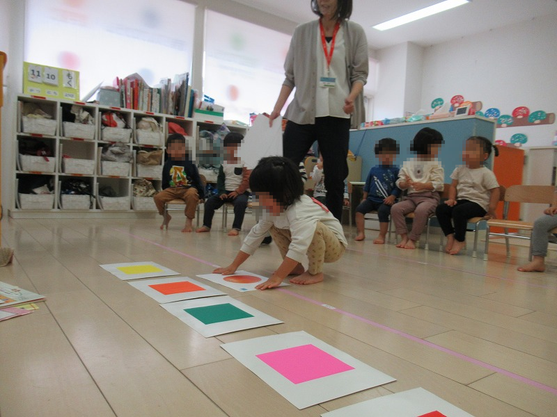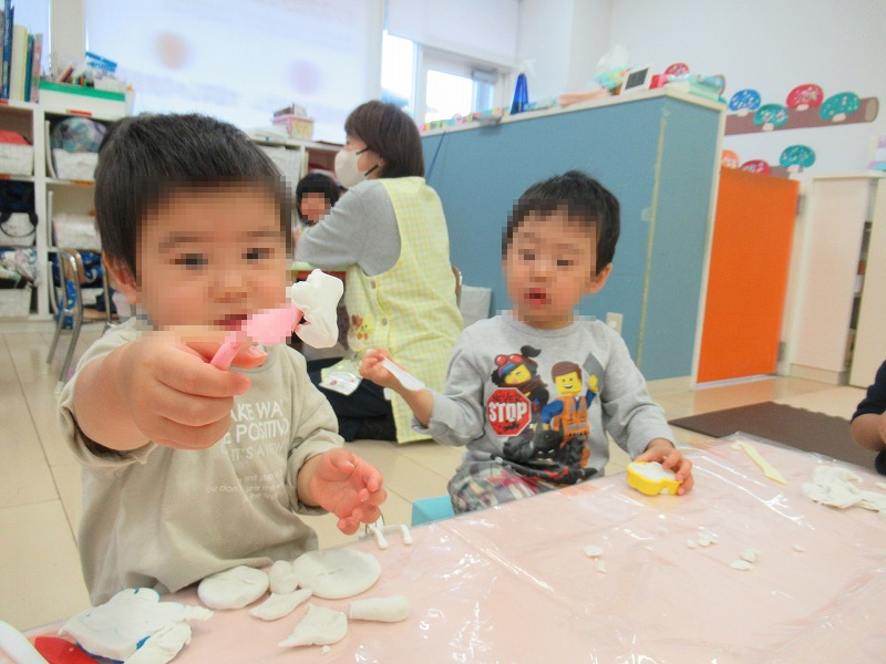 下の写真は設定保育「ねんど遊び」とこども達の大好きな「大布遊び」♪