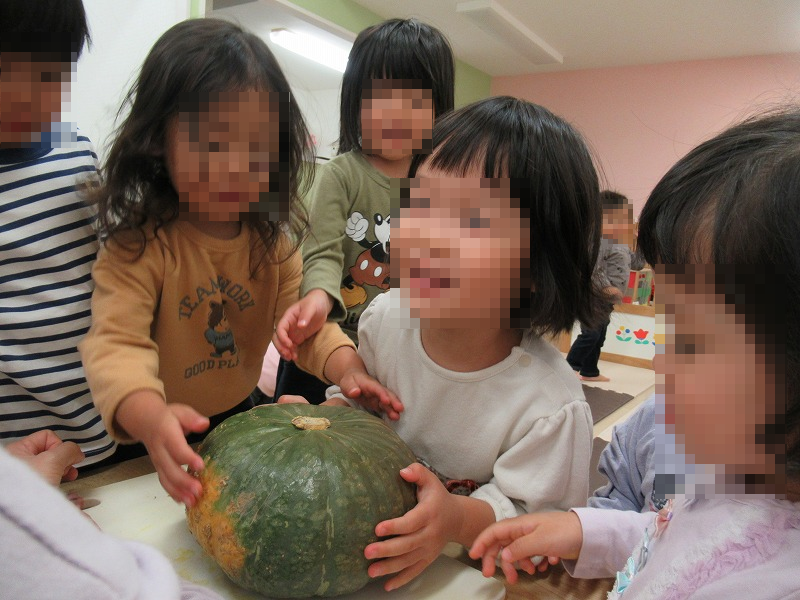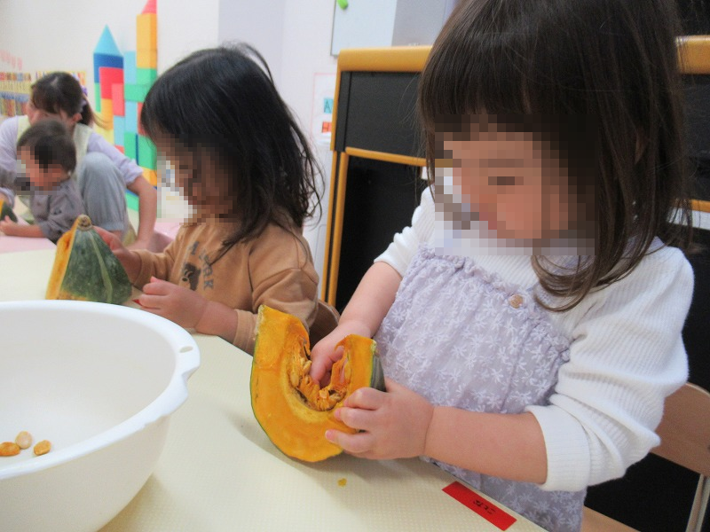 今週の食育はかぼちゃの種とりをしました。大きなかぼちゃを抱えた後に、かぼちゃを切ると〜、うわぁー種がたくさん!みんなで協力して種取り開始〜♪
