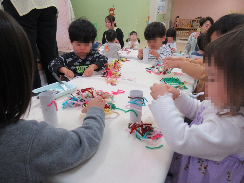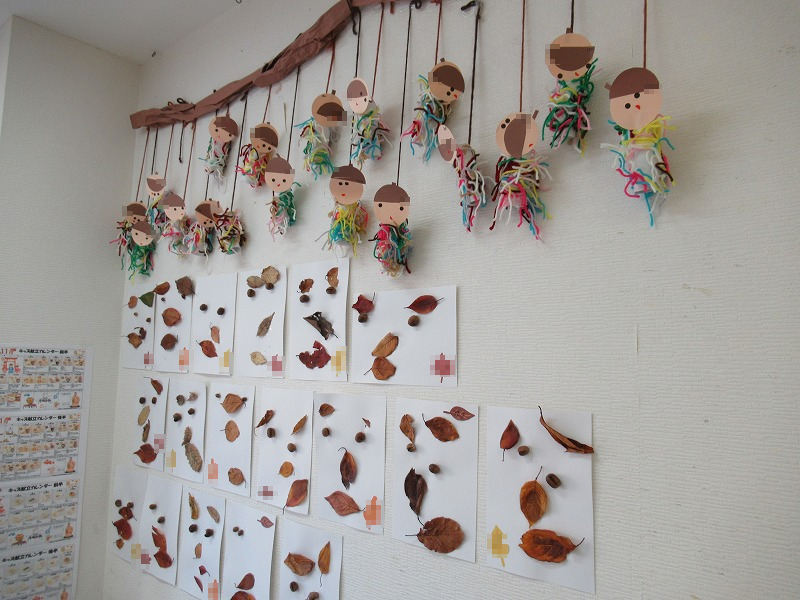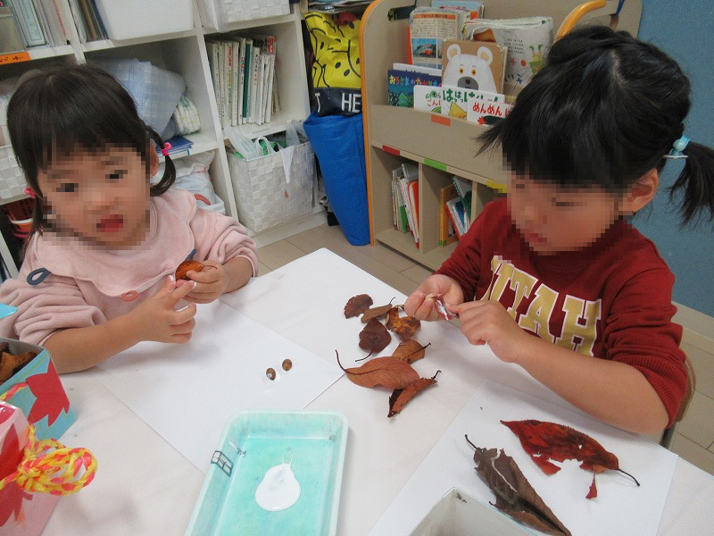 先週はミノムシ工作、今週は落ち葉拾いで集めた落ち葉で福笑い工作をしました。どちらも糊とボンドを使う、集中力が必要な難しめの工作ですが、こども達、真剣な表情で見事に作り上げていっています。