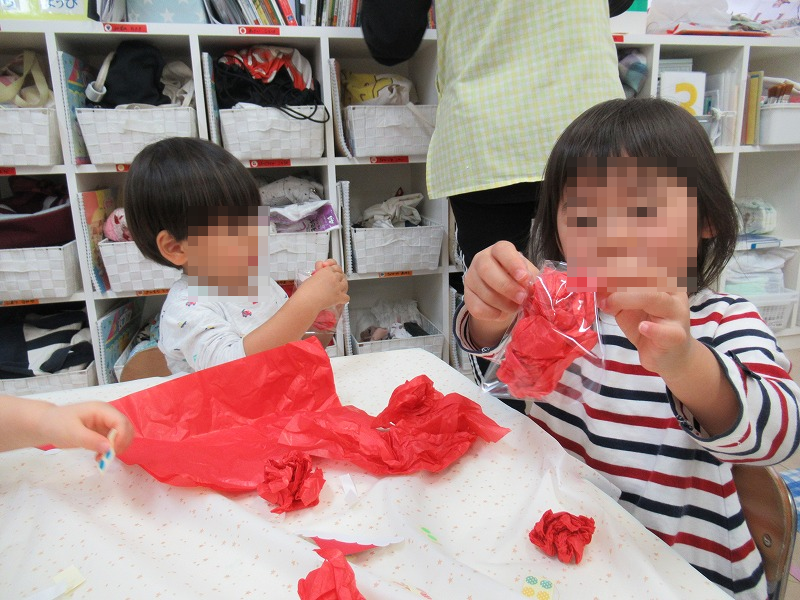 描いたり、丸めたり、袋につめたり、糊を塗ったり、貼ったり♪