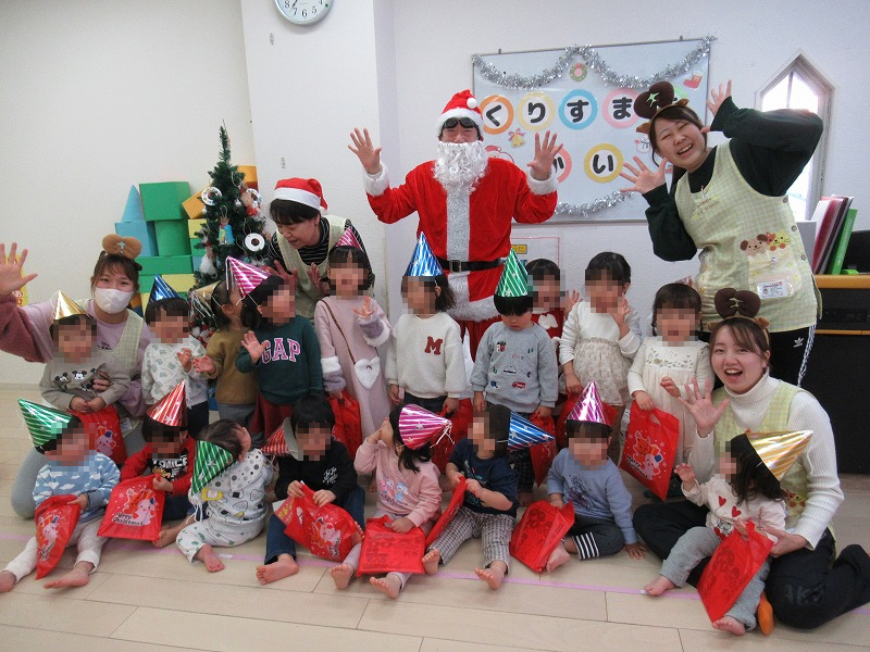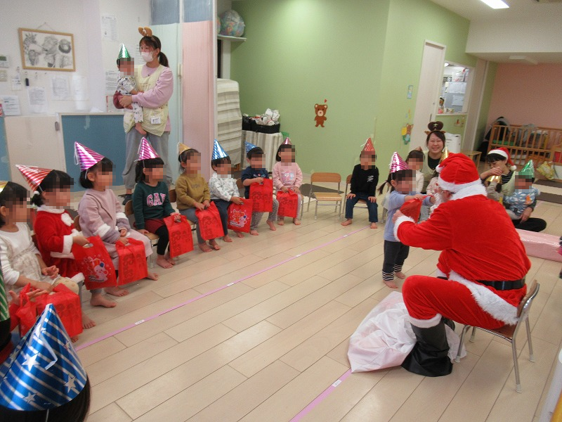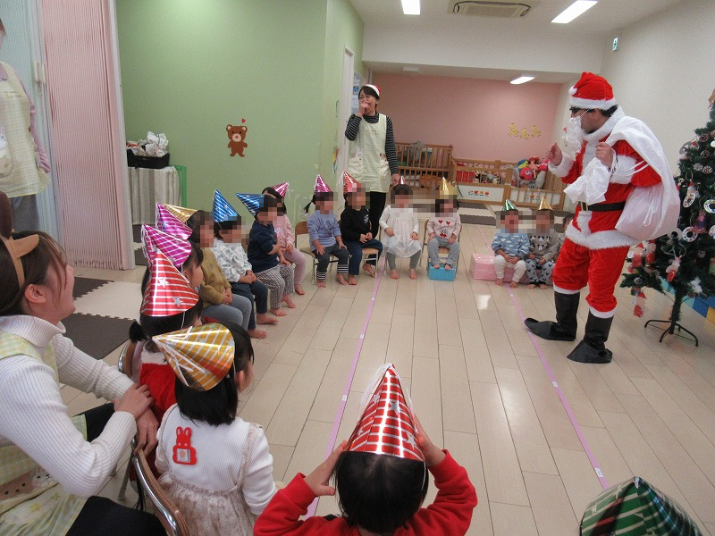 クリスマス会と言えばサンタクロース!サンタさんの登場です(^-^)みんな「サンタさん来てくれるかな〜」って楽しみにしていたのに、いざ登場すると、幼児の必殺技(ザ・かたまり)の続出です(笑)