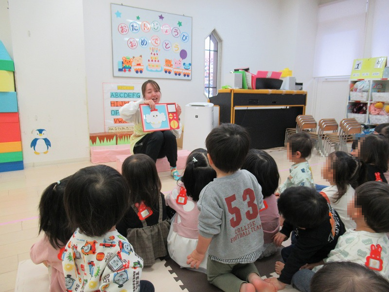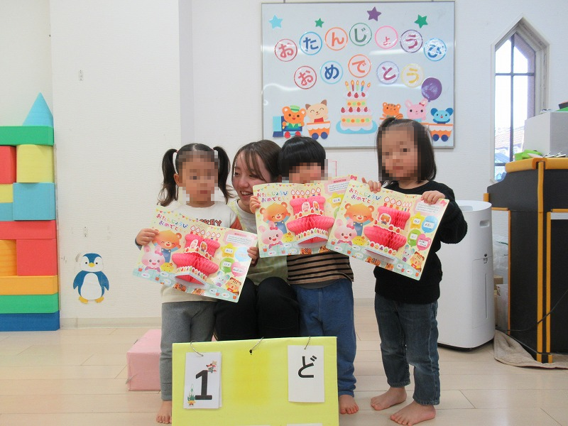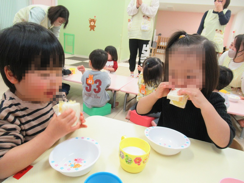 1月はKくん、Yくん、Hさんの満3歳のお誕生月(^-^)恒例の先生達の出し物を楽しんだら、バースデーカードを受け取って〜♪みんなでお歌のプレゼント♪この日のおやつはみんなの大好きなフルーツサンド、牛乳でカンパーイ!