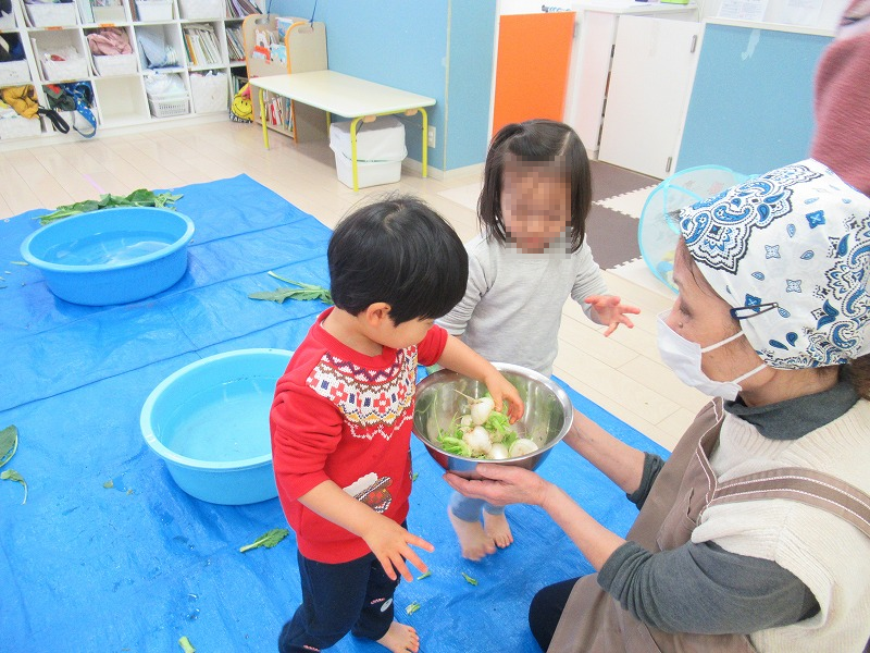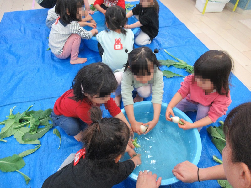 収穫したカブは、葉っぱをとって、きれいに水洗いをします♪きれいになったら給食師さんに渡しにいきます「美味しく料理してくださーい!」