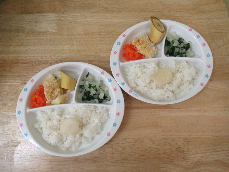 この日の給食はみんなで育てたカブが一品追加されました(ごはんの真ん中にのせています)。いつもは先生が声掛けしないと残しがちなカブもこの日だけは自らパクパクモグモグでしたよ(^o^)/