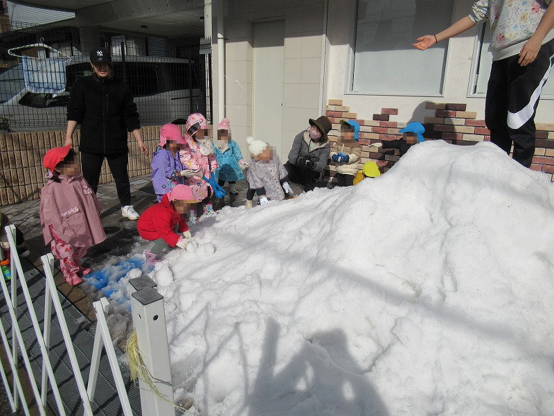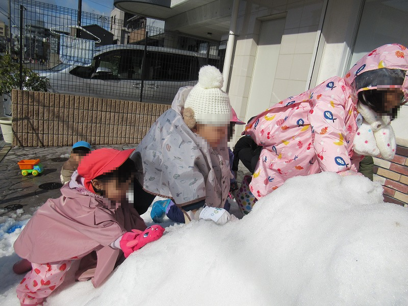 この日の朝は武庫之荘ウェリナの園前に雪山が出現。はじめは怖々な子どもたち(笑)、しばらくすると雪のなかに突撃〜(^o^)