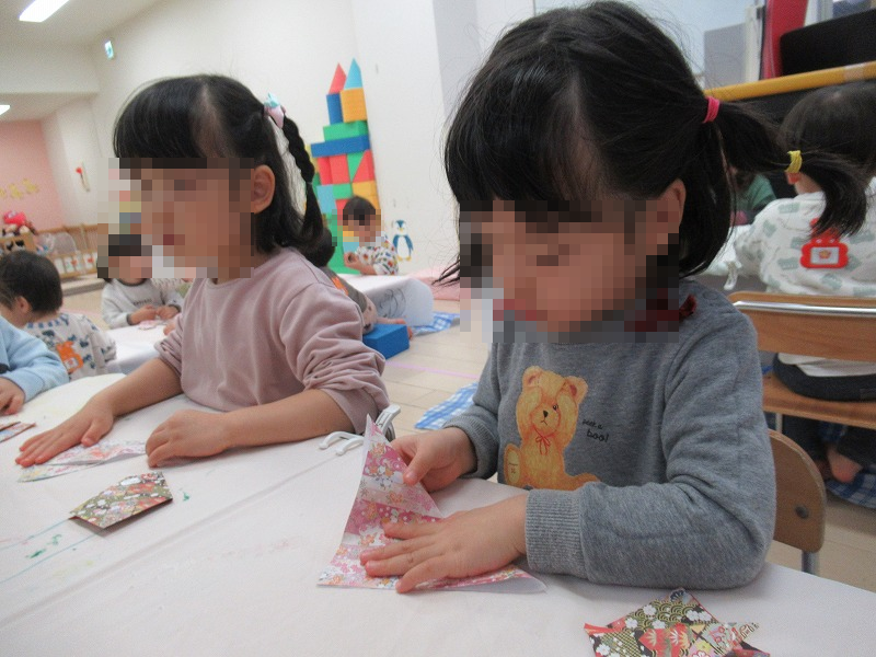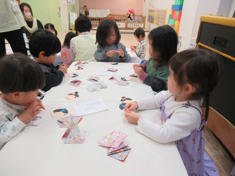 ひな人形作りをしました。きれいな折り紙を折って〜♪糊を指につけて〜ぬりぬり♪パーツをつけて〜ぺたぺた♪