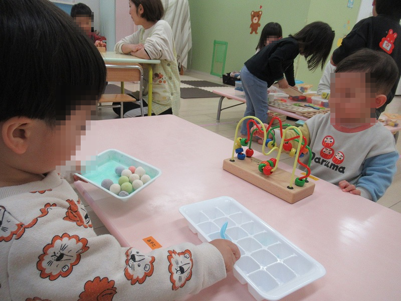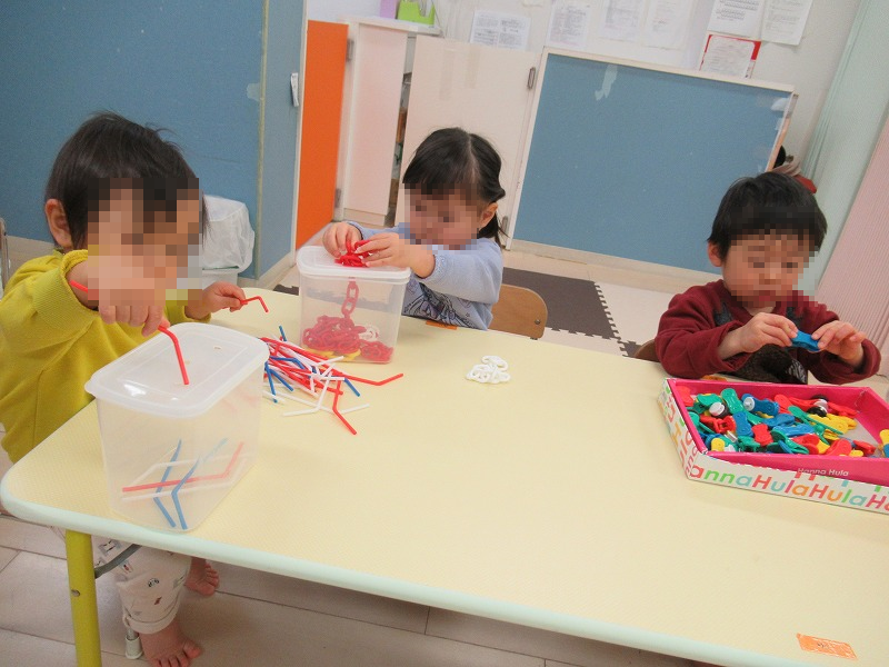 上の写真はEcc英会話を楽しむ赤組(2才児)さん下の写真はモンテッソーリ玩具に興じるオレンジ・黄組(0,1才児)さん
