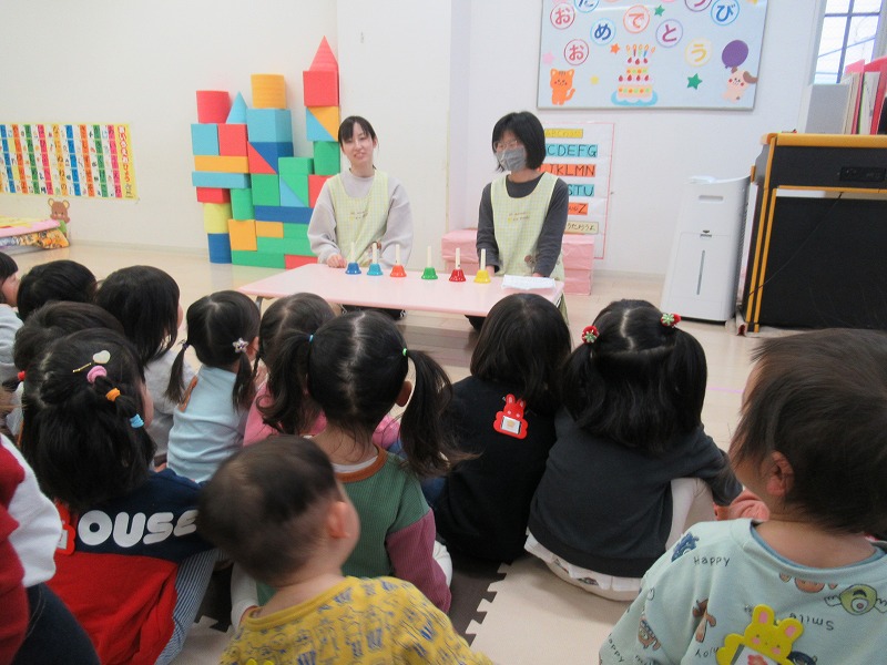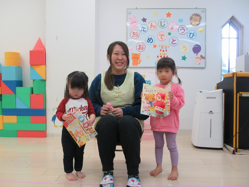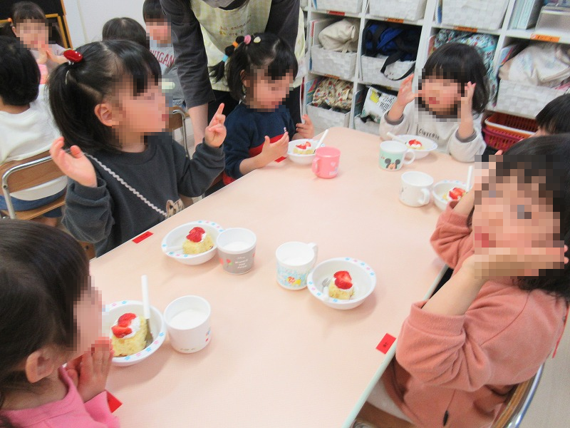今週は2月生まれのお友達のお誕生月会がありました。先生からバースデーカードをもらったら、みんなでお歌のプレゼント♪恒例の先生達の出し物を楽しんだら、手作りイチゴのショートケーキ、牛乳でカンパーイ!