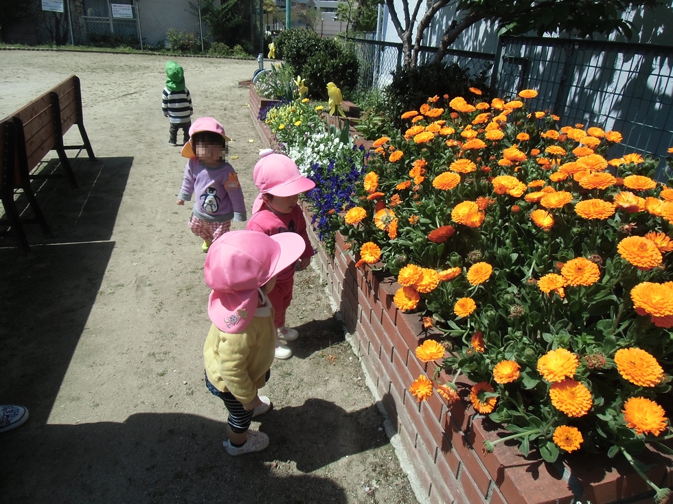 でも、花壇のお花がすごくキレイで子天使ちゃん達もジッと見つめていました。