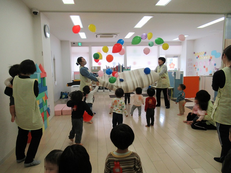 2日目の設定保育も新入園児さん向け、恒例の大布風船遊び。始まると泣き声がピタリと止まり興味津々の子天使ちゃん達(笑)