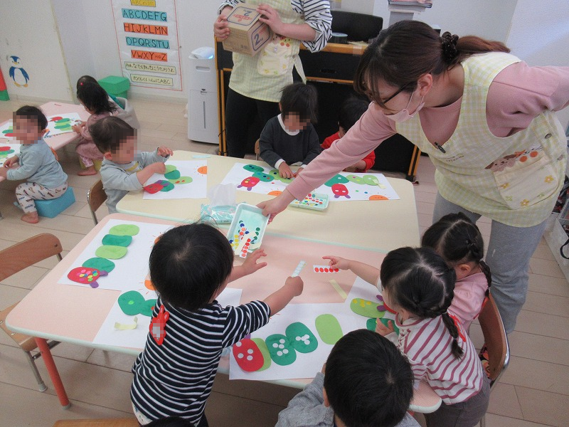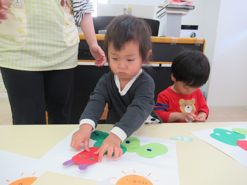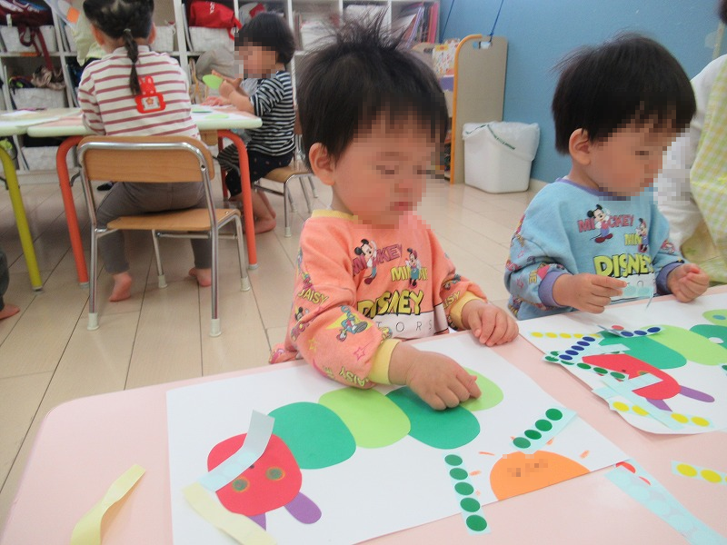 昨年からの在園児さんは「あおむし」の貼り絵から、新入園児さんはシール貼り。