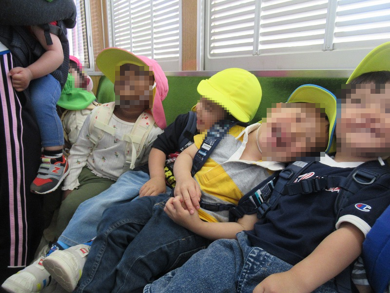 帰りの電車に乗り込んでもテンションが高いままの園児たち、笑い合ったりふざけ合ったりしています(^-^)10分経ち・・15分経ち・・みんなウトウト(笑)
