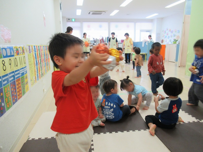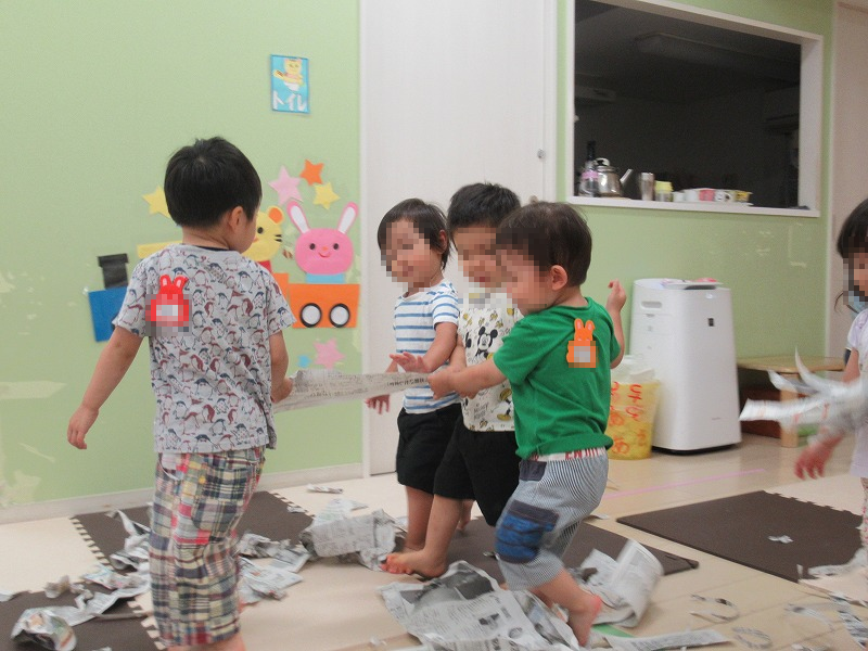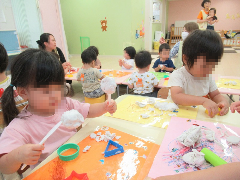 写真は子ども達に大人気の「ちらかし遊び」、下の写真は「宝探しゲーム」と「粘土遊び。」ウェリナの午前保育は特別プログラム(ダンス、英会話、工作、数字遊び、文字遊び、音楽リズムプログラム、モンテッソーリ、体育プログラム)。午後保育は設定保育(令和6年度設定保育数は約110種)