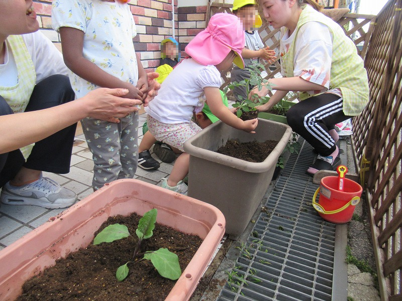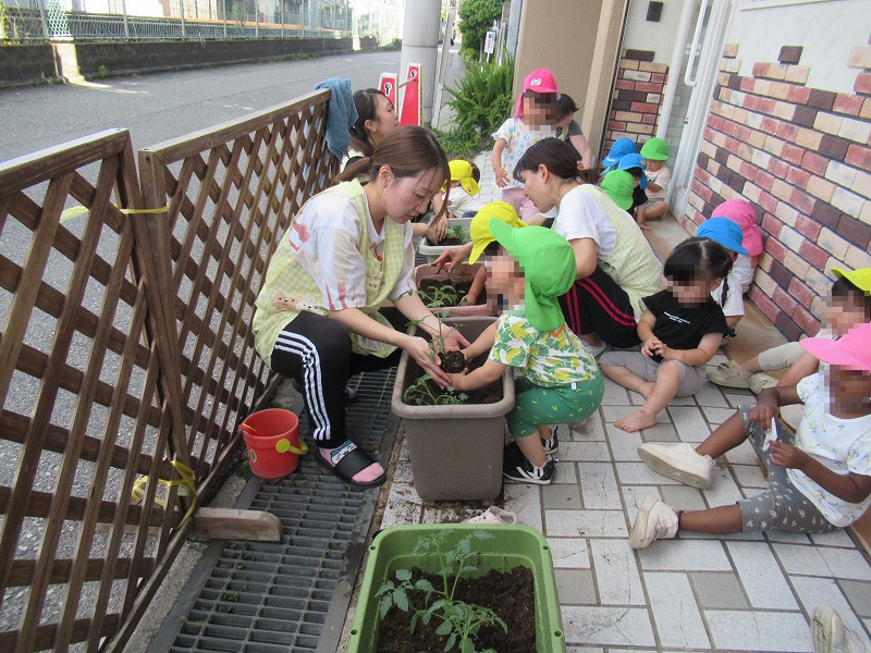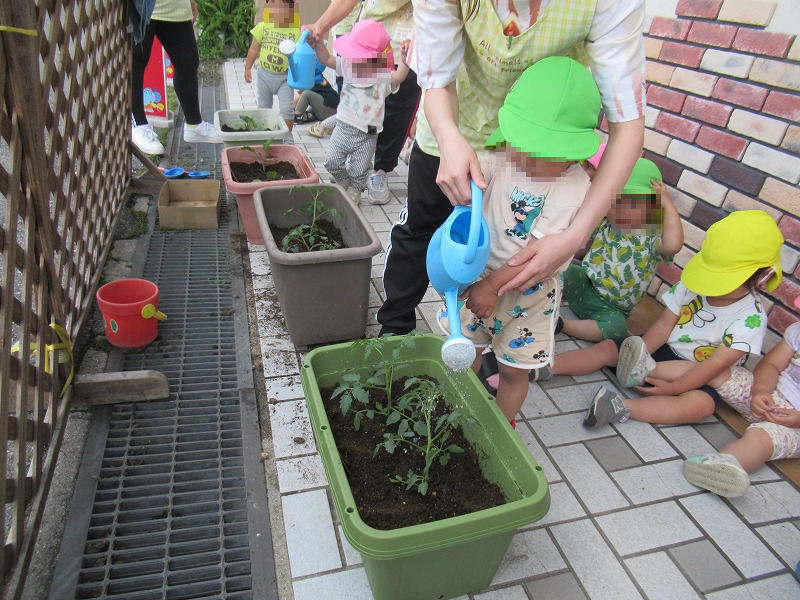 次に赤組さんが苗を植えて〜♪オレンジ・黄組さんが土をかけて〜♪ お水をやります。