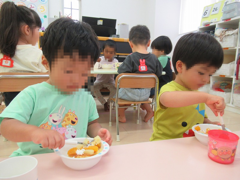 先生からバースデイカードを受け取ったら、みんなでお歌のプレゼント♪恒例の先生達の出し物を楽しんだら、給食師さん手作りのフルーツケーキ、牛乳でカンパーイ!