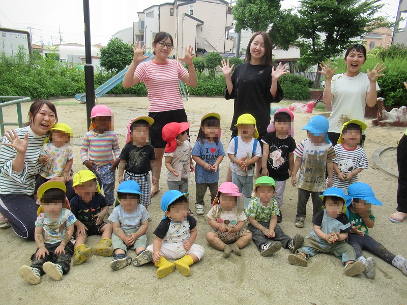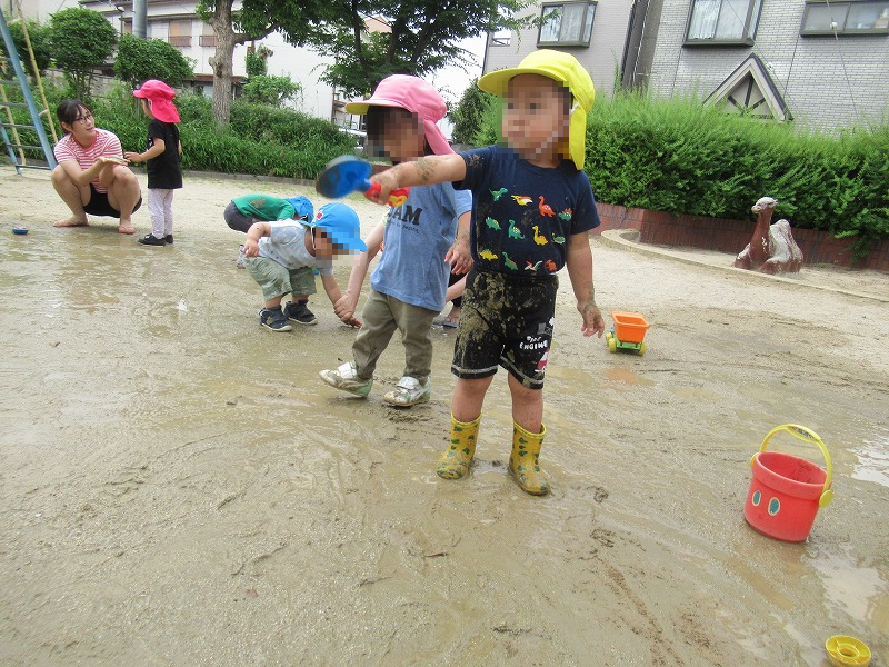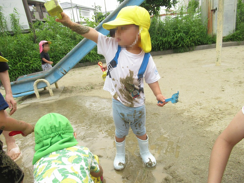 日頃はできない泥んこ遊び。最初は怖々と泥に触っていた子ども達、5分もするとベチャベチャ〜♪ヌメヌメ〜♪「キャハハハ!」、「○×△□※ー!」言葉にならない叫びをあげて大はしゃぎ!(笑)