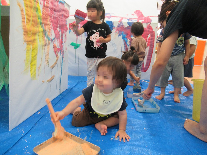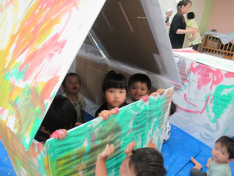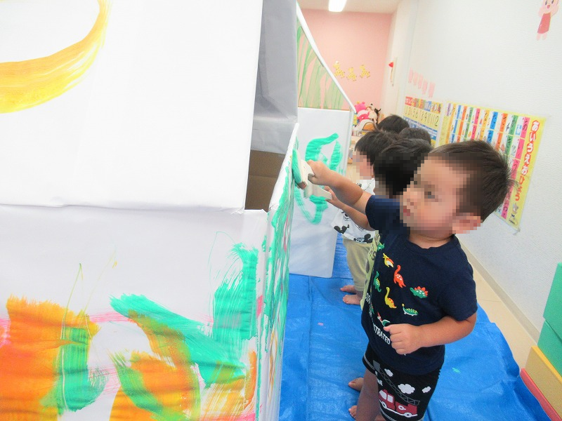 お家の壁にペンキ(実際は絵の具を使っています)をぬりぬり♪